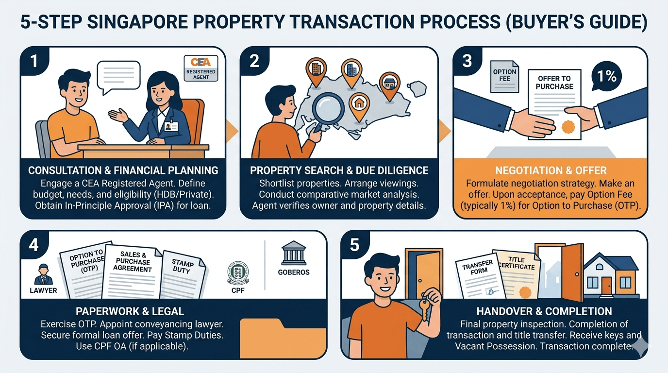 A typical property transaction in Singapore follows five stages: